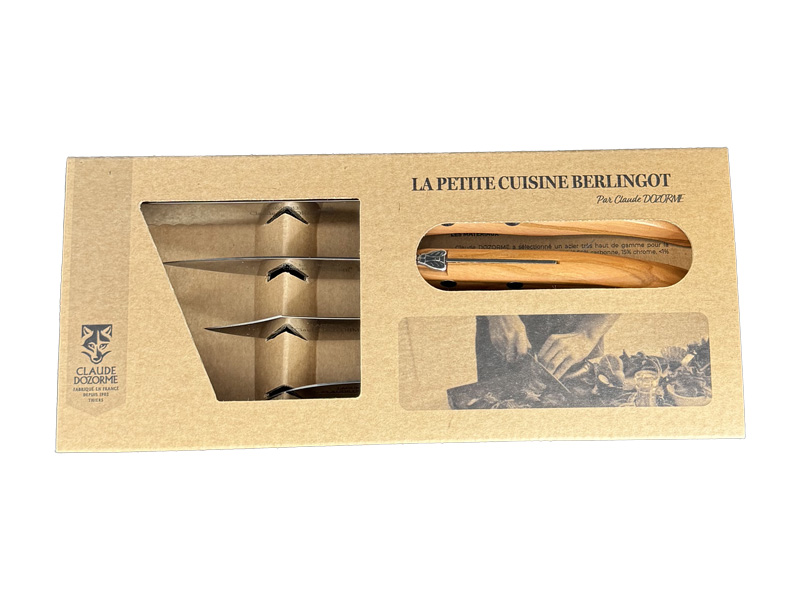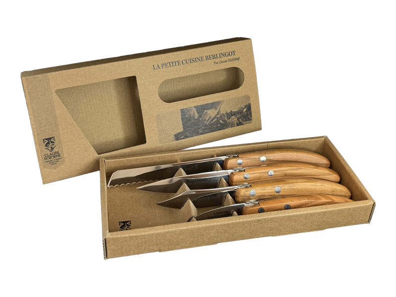 Coffret de 4 couteaux de la marque française Claude Dozorme La Petite Cuisine Berlingot avec des lames en acier X46Cr13 et un manche en olivier.