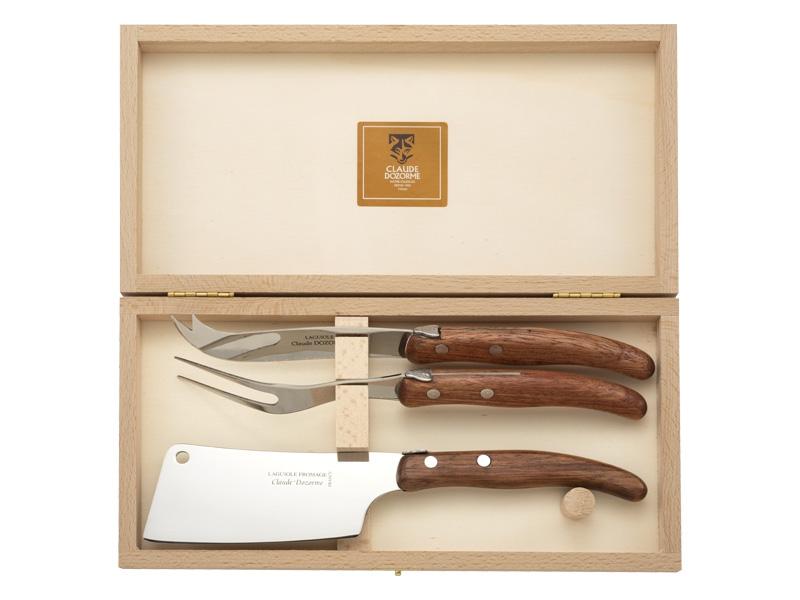 Coffret spécial fromage Laguiole de la marque française Claude Dozorme livré avec son coffret en bois, comprenant un couperet, un couteau à fromage, une fourchette, en inox et un manche en kotibé.