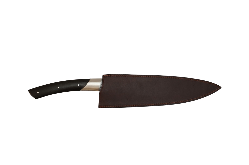 Le petit couteau de chef Les Grands Gourmets par Chambriard est livré en coffret, avec une protection de lame en cuir brun.