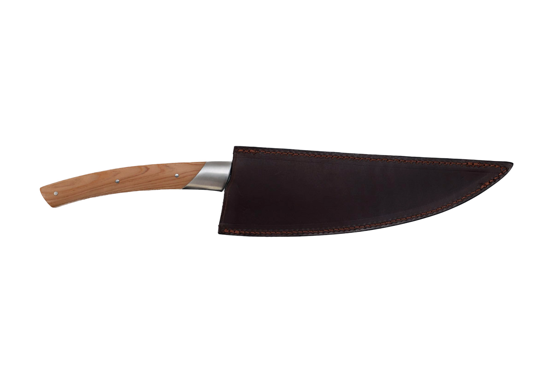 Le petit couteau de chef Les Grands Gourmets par Chambriard est livré en coffret, avec une protection de lame en cuir brun.