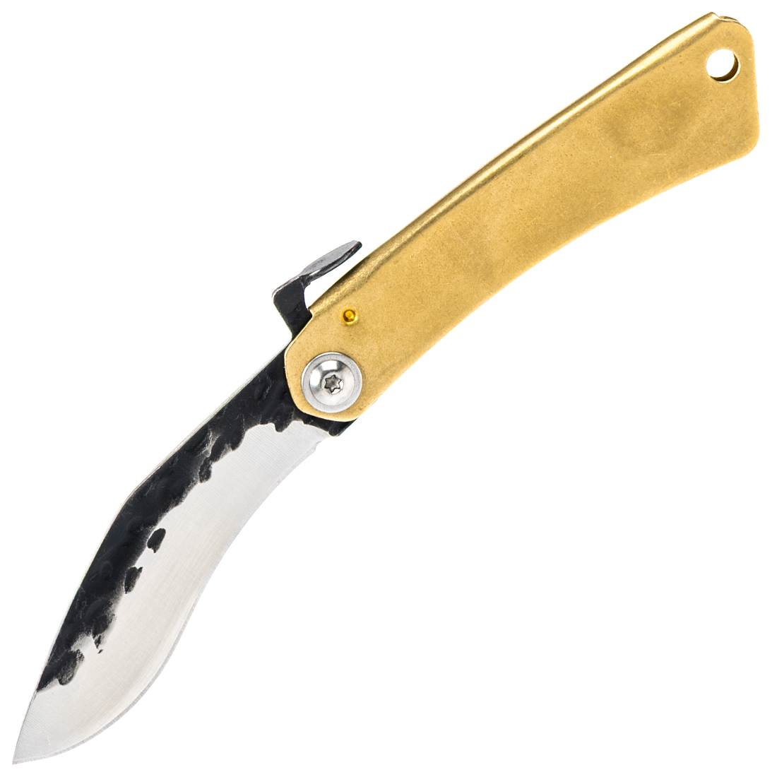 Ce couteau est muni d'une lame en acier 3Cr13Mov, finition brut de forge martelé, montée sur un manche en laiton.