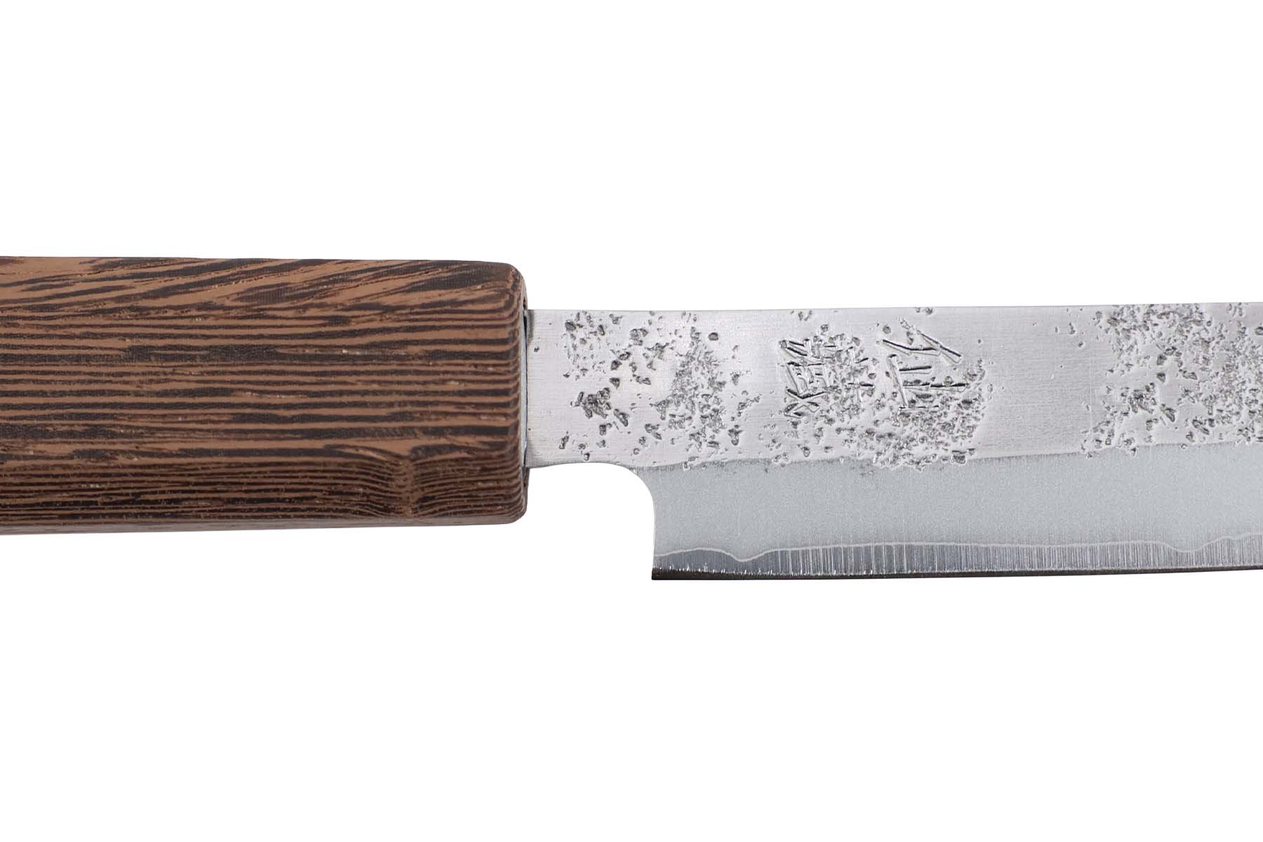 Lame en acier inoxydable Ginsan (Silver 3) (60±1 HRC), finition brut de forge sur le haut de lame.