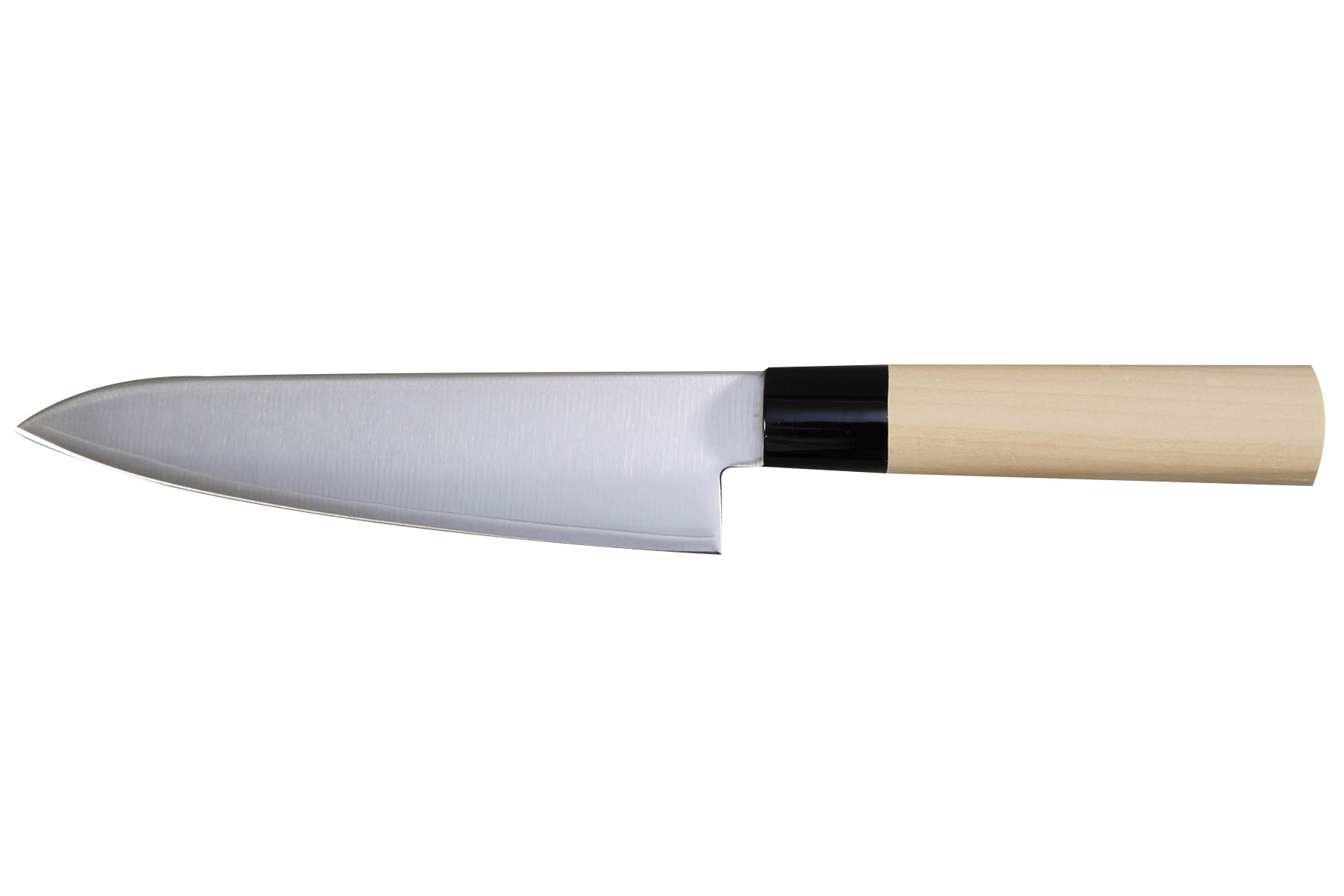 Le fameux couteau de chef, qui est en fait un parfait "polyvalent de cuisine" ; il est un incontournable de la cuisine européenne. Plutôt orienté viande et poisson (le polyvalent japonais "santoku" est plutôt orienté légumes). Disponible en plusieurs tailles de lames, ici en 18 cm.