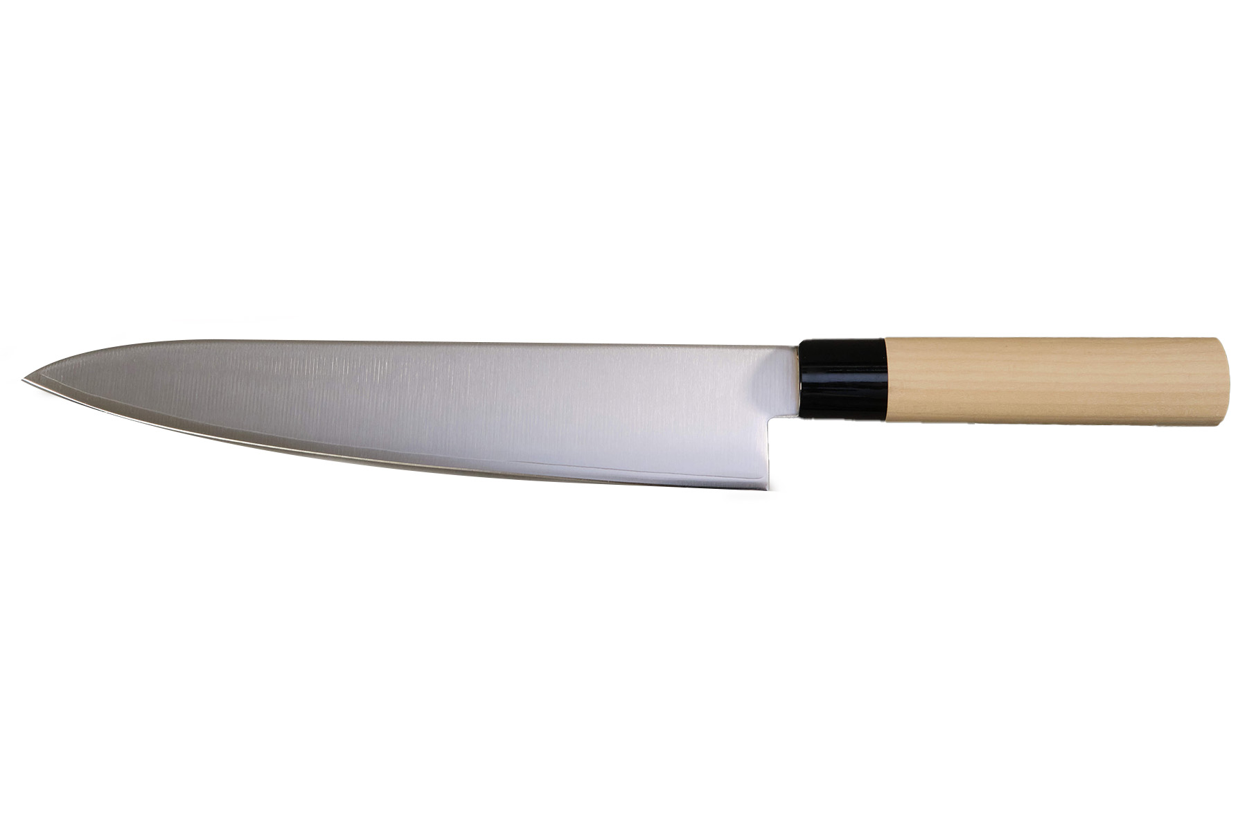 Le couteau de chef, nommé gyuto par les Japonais, est un couteau de cuisine polyvalent qui convient pour toutes les découpes avec une orientation particulière pour la préparation de la viande en raison de sa lame pointue.