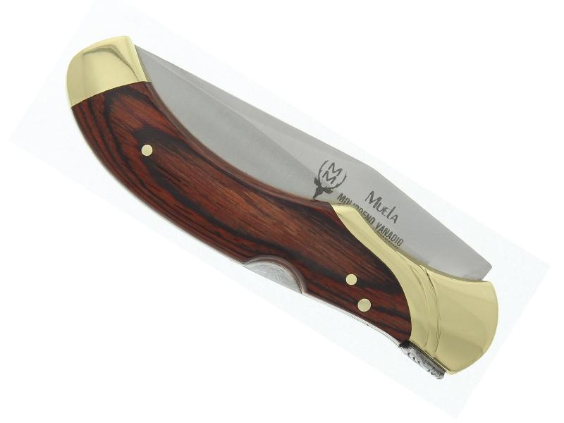 Couteau GL de chez Muela avec une lame à cran en acier inox X50CrMoV15, un manche de 12 cm en stamina, des mitres en laiton et un ressort en forme d'abeille.
