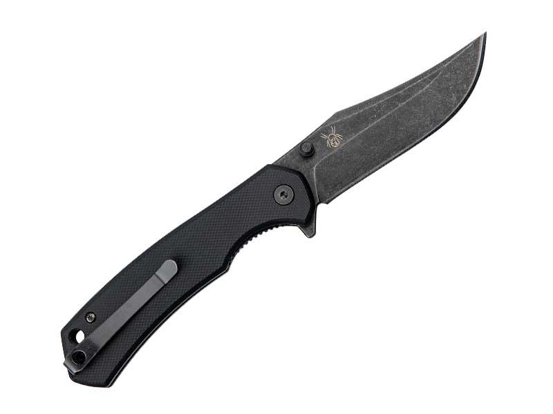 Couteau Vibora de chez Muela avec bouton double et cran intérieur, une lame en acier D2 finition blackwash et flipper, un mécanisme Ball bearing et un manche de 10,5 cm en G10 noir.