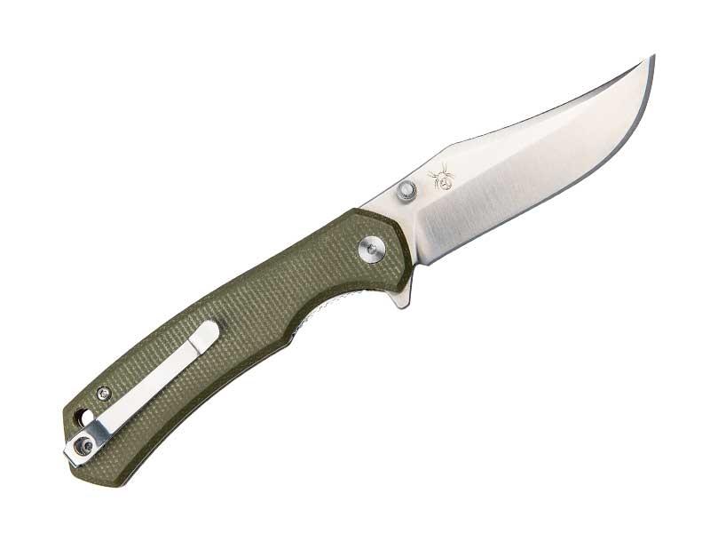 Couteau à cran et bouton double Vibora de chez Muela avec une lame en acier D2 et flipper, un mécanisme Ball bearing et un manche de 10,5 cm en micarta vert.