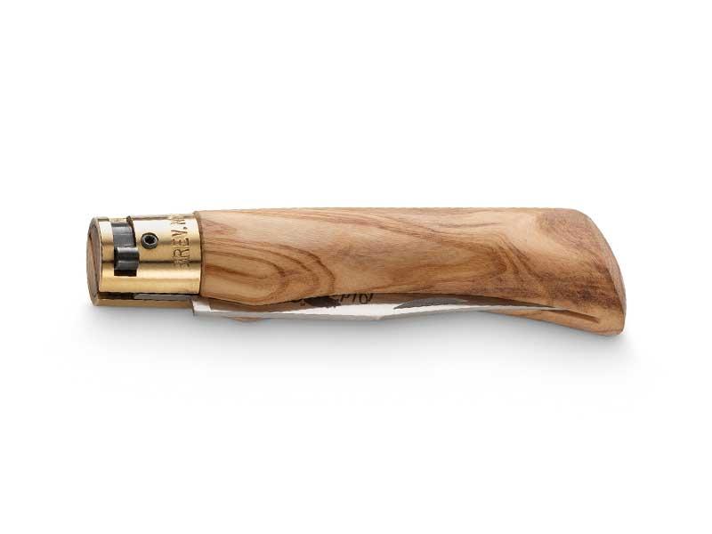 Couteau taille L de la marque italienne Old Bear comprenant une lame à dents en acier 1.4060, une virole de sécurité en laiton brossé avec une position ouverte ou fermée ainsi qu'un manche de 12 cm en olivier traité à l'huile.