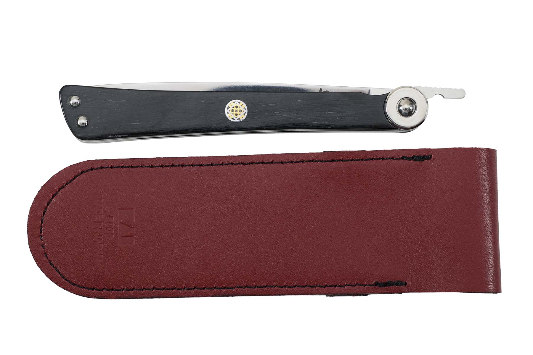 Ce couteau pliant est livré avec un étui en cuir.