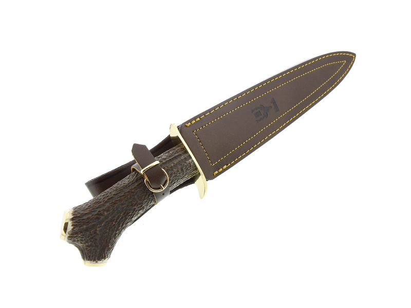 Dague de chasse Bear de chez Muela avec une à lame double tranchant de 24 cm en acier inox X50CrMoV15, un manche en cerf véritable avec départ d'épois et une monture inox.