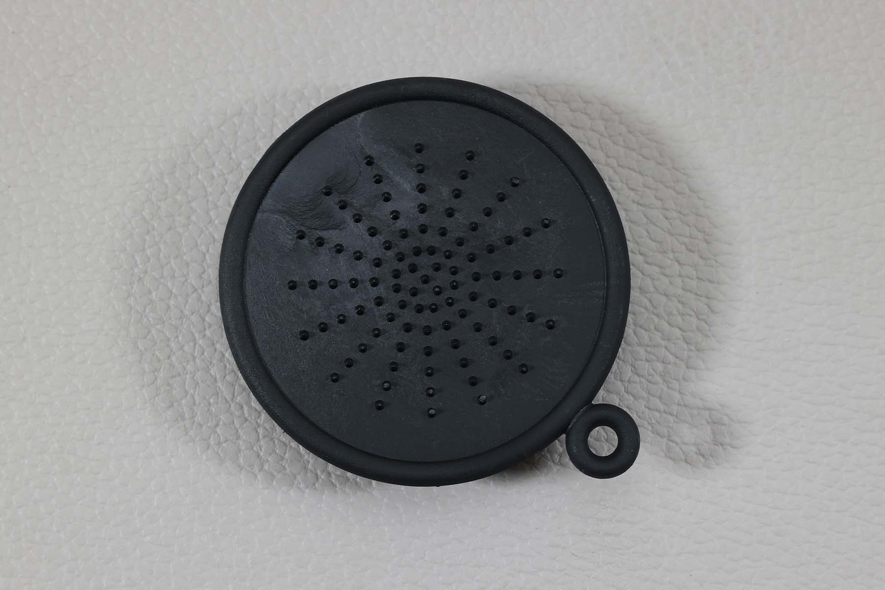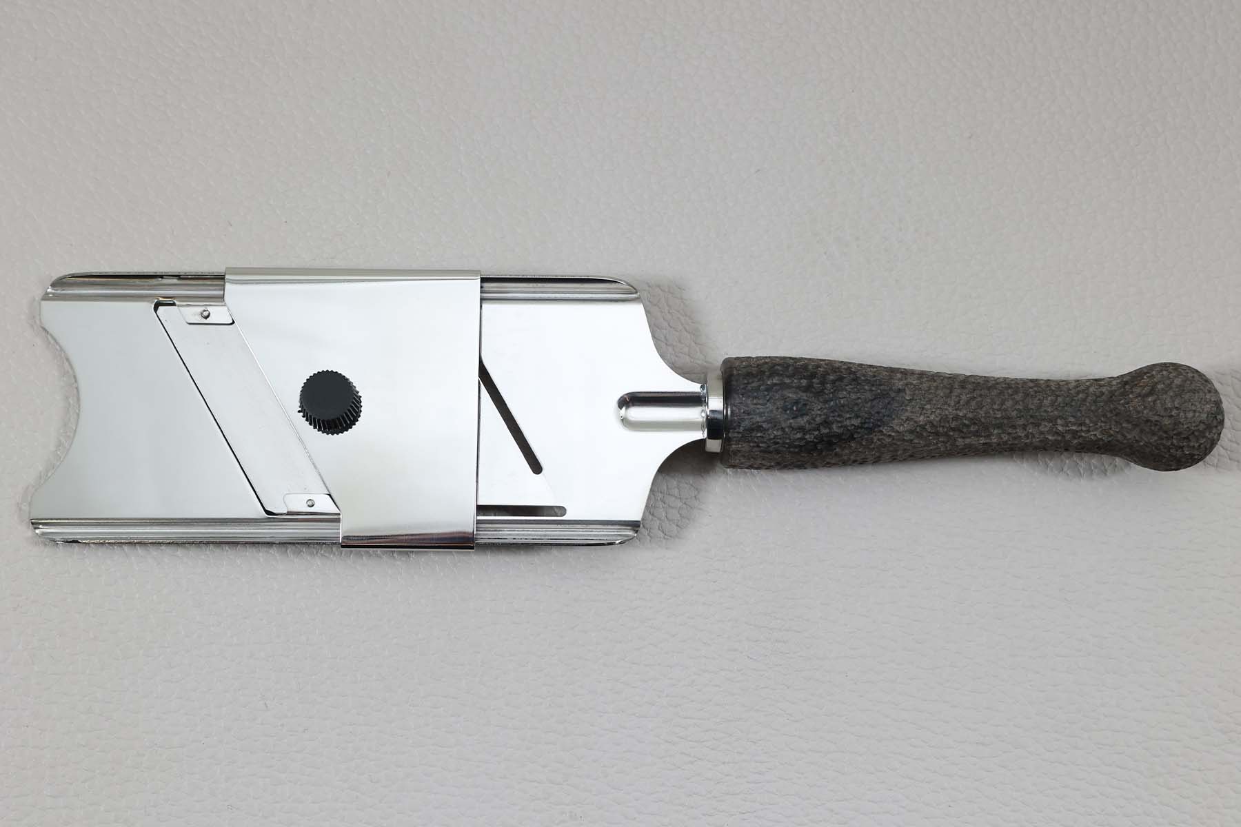 Cette mandoline dispose d'une lame en acier inoxydable montée sur un manche type boule en ébène truffé.
