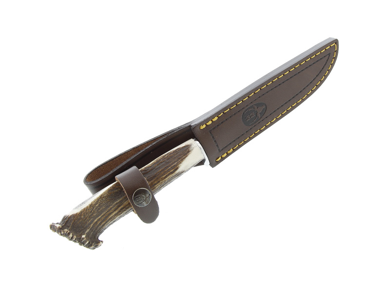lame de 14 cm en inox poli glace, une garde inox et un manche en cerf véritable.