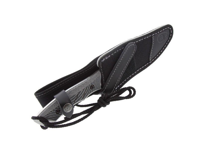 Poignard de chasse Typhoon de chez Muela avec une lame de 15 cm en acier inox X50CrMoV15 et manche en micarta gris veiné.