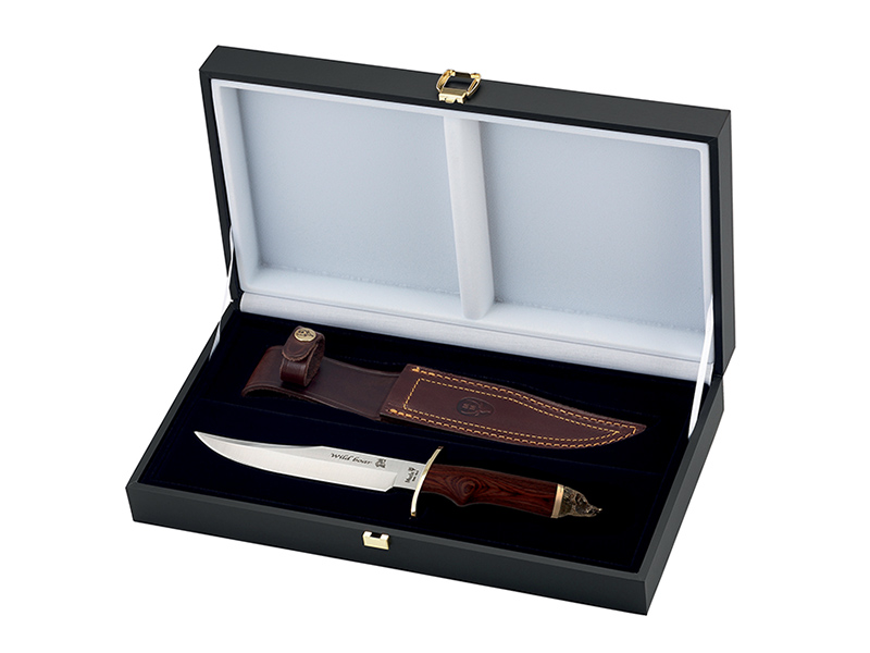 Poignard Wildboar de chez Muela avec une lame en acier inox X50CrMov15, une garde en laiton et un manche en stamina avec une tête de sanglier en laiton.