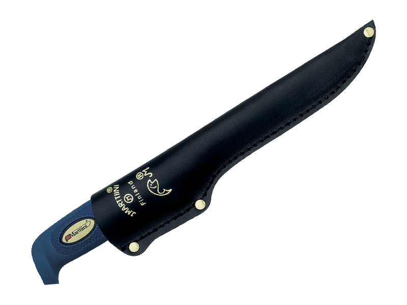 Poignard de la marque finlandaise Martiini  comprenant une lame flexible à filets de 18 cm en inox recouverte de Martef et un manche bleu en gomme.